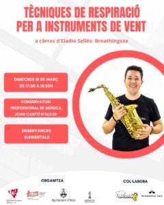 TÈCNIQUES DE RESPIRACIÓ PER A ENSENYANCES ELEMENTALS A càrrec de Eladio Sellés, el dimecres 18 de març en el Conservatori Professional de Música Juan Cantó d’Alcoi Compartir Dejar un comentario Submit a Comment Cancel·la les respostesL'adreça electrònica no es publicarà. Els camps necessaris estan marcats amb *Comentari * Nom * Correu electrònic * Lloc web Desa el meu nom, correu electrònic i lloc web en aquest navegador per a la pròxima vegada que comenti.