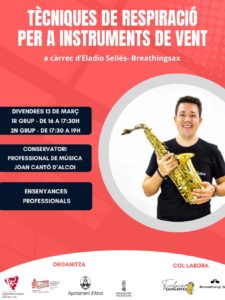 TÈCNIQUES DE RESPIRACIÓ PER A ENSENYANCES PROFESSIONALS A càrrec de Eladio Sellés, el divendres 13 de març en el Conservatori Professional de Música Juan Cantó d’Alcoi Compartir Dejar un comentario Submit a Comment Cancel·la les respostesL'adreça electrònica no es publicarà. Els camps necessaris estan marcats amb *Comentari * Nom * Correu electrònic * Lloc web Desa el meu nom, correu electrònic i lloc web en aquest navegador per a la pròxima vegada que comenti.